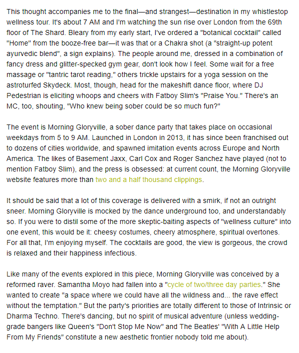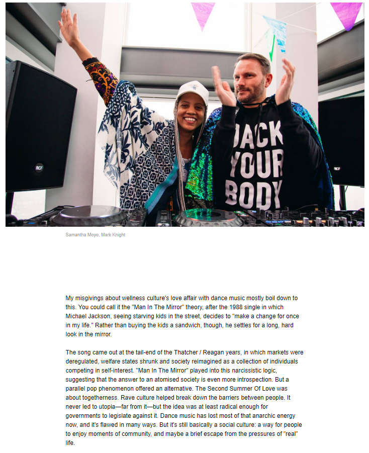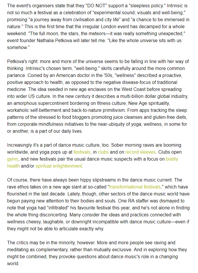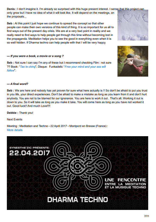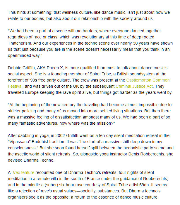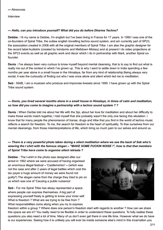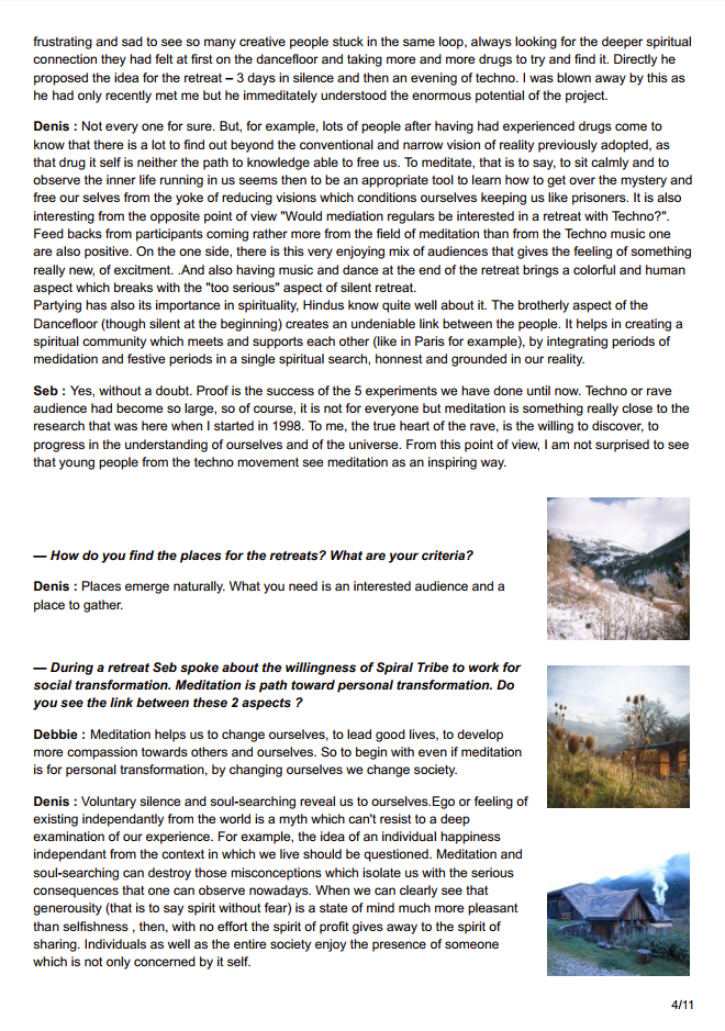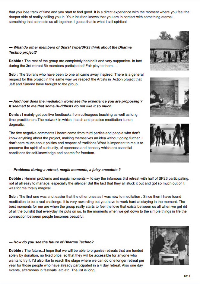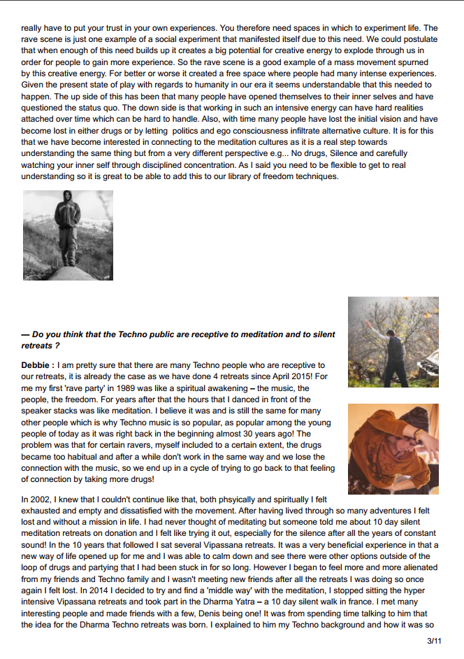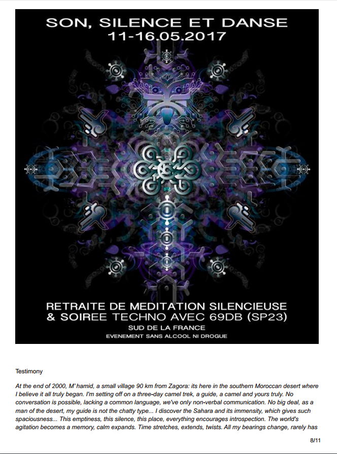 Robberechts suggested a three-day silent retreat with an evening of techno, as an introduction to meditation for ravers.