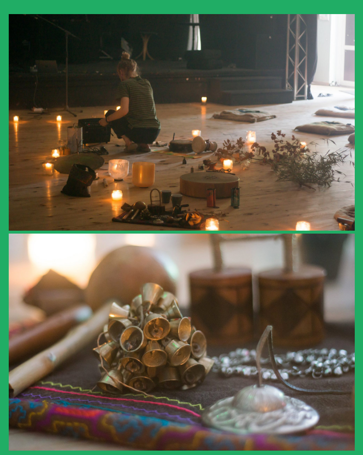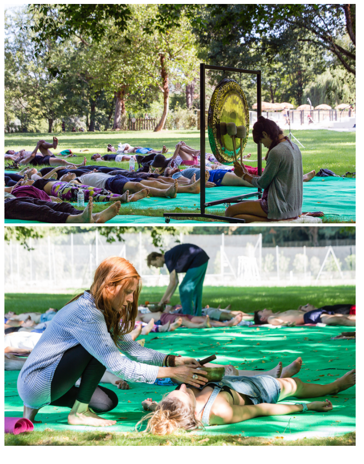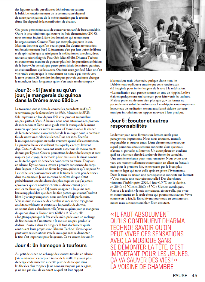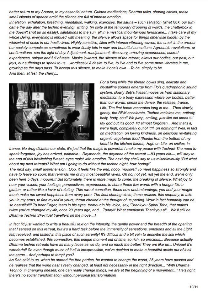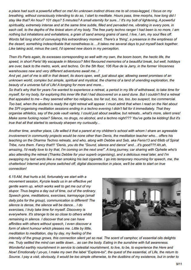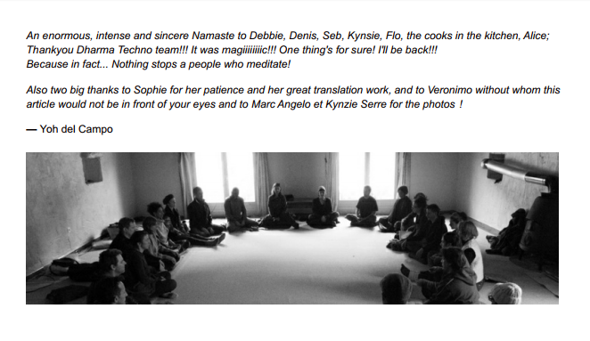 From these two worlds, Dharma Techno was born. The first three retreats took place in the Drôme department of southeastern France. The space used there has a number of rooms with two to three beds each, a large kitchen, dining room, and a great hall that serves as the meditation room, movement room, and techno dance floor.